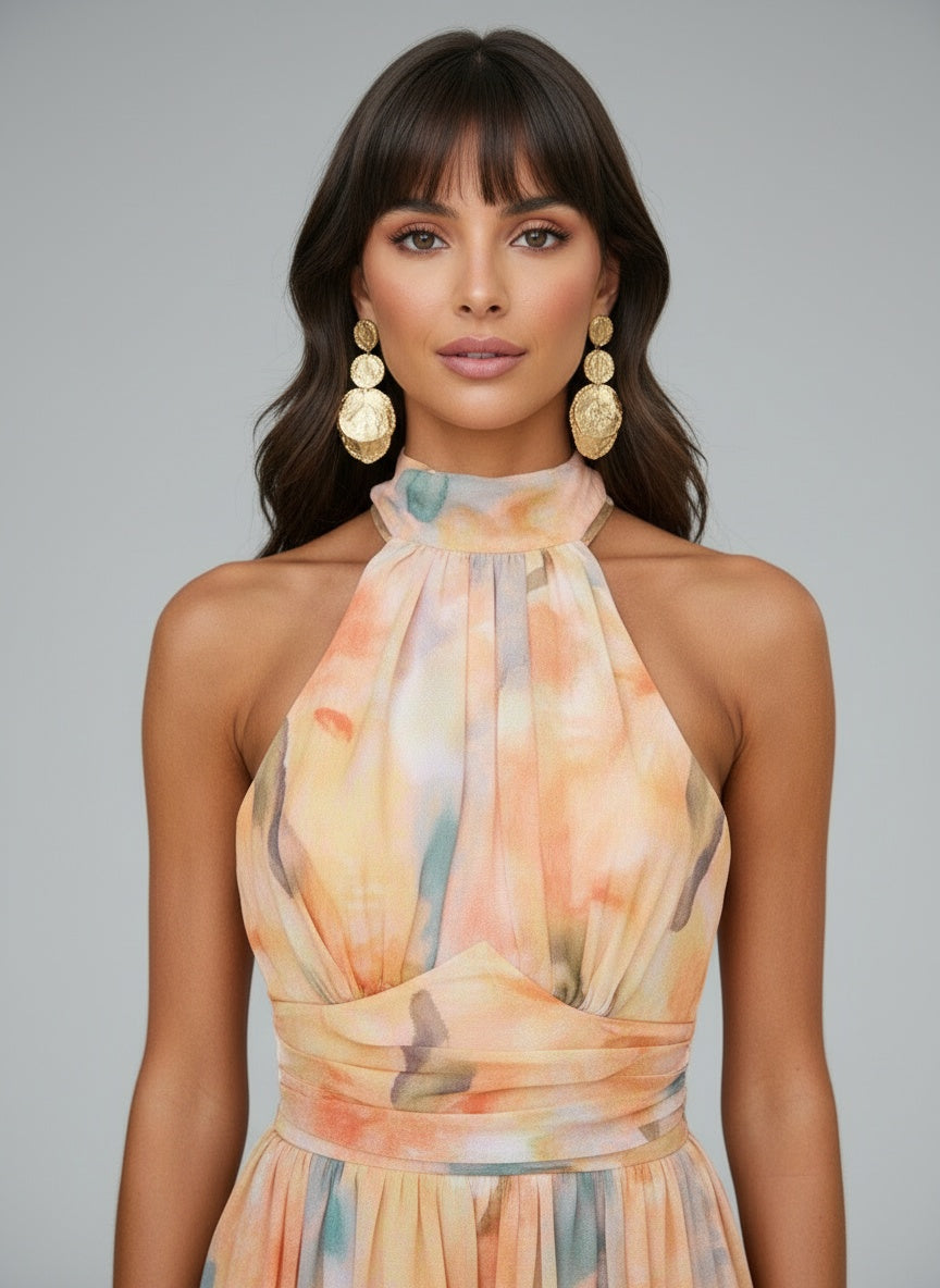 Leicht wie eine Sommerbrise und so strahlend wie ein Sonnenuntergang – das Eline™ Kleid fängt die Schönheit warmer Tage in einem traumhaften Aquarelldruck ein. Mit seinem eleganten Halter-Schnitt und dem fließenden Silhouette ist dieses Kleid die Verkörperung weiblicher Eleganz.
